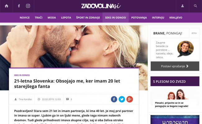 (Na vprašanja bralk odgovarjam v sklopu portala zadovoljna.si. To vprašanje in odgovor sta bila objavljena tej povezavi. Svoja vprašanja pa lahko oddate na tej povezavi.) Pozdravljeni! Stara sem 21 let in imam partnerja, ki ima 40 let. Je moj prvi partner in imava se super. Ljubim ga in on ljubi mene, glede tega nimam…