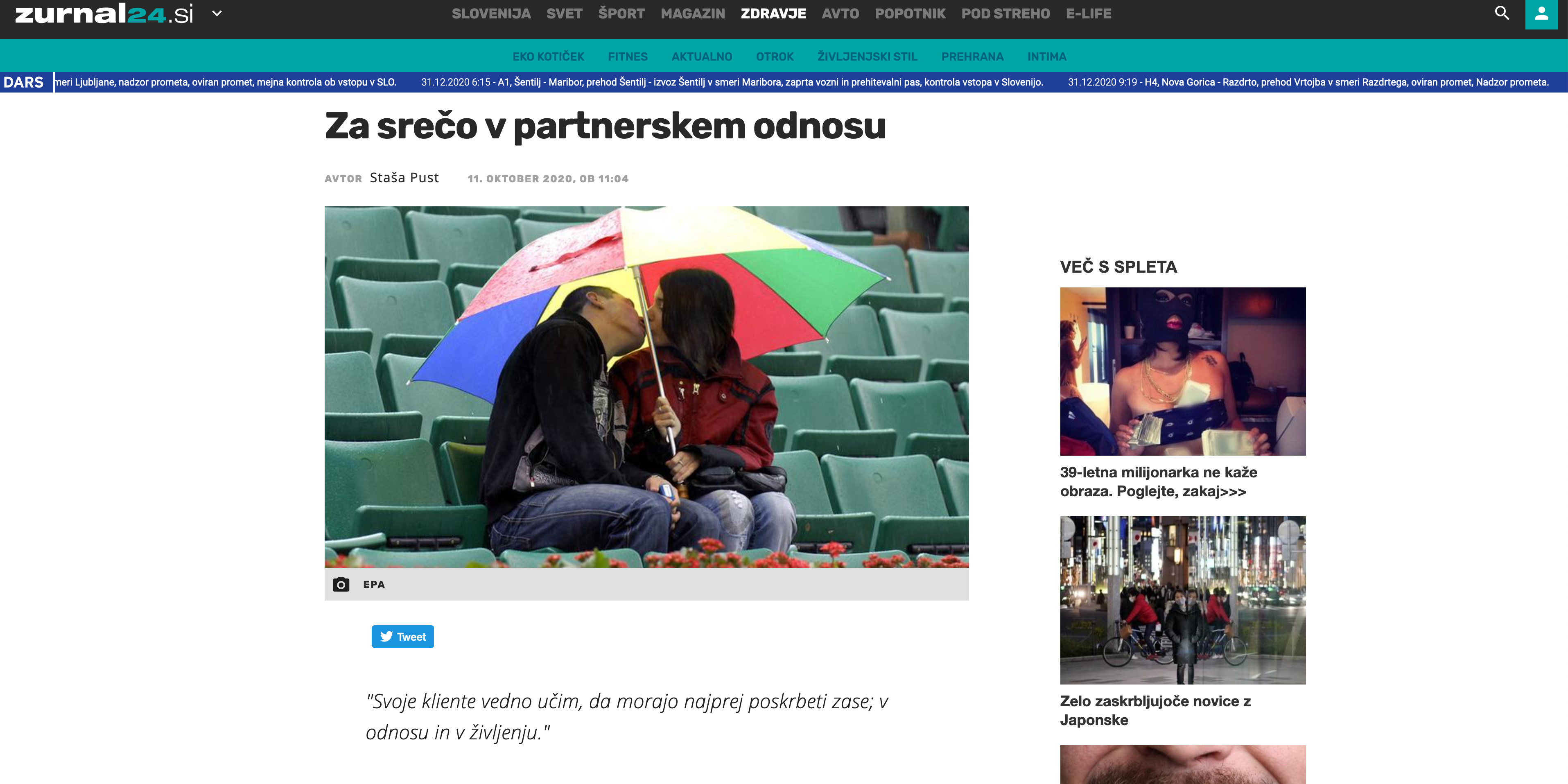 Najboljši nasvet, ki ga lahko dam za srečno partnerstvo je, da ne poskušajte spreminjati svojega partnerja. Največja ovira na poti do srečnega partnerskega odnosa je namreč ravno ta, da poskušamo izničiti razlike, ki obstajajo med nami in našim partnerjem. Ne zavedamo se, da je ravno drugačnost tista, ki nas v prvi vrsti privlači pri našem partnerju in zaradi katere naš odnos lahko obstane. To je zelo evidentno, ko na terapiji paru postavimo vprašanje, katere stvari so ju na začetku pri partnerju najbolj privlačile, saj ponavadi naštejeta ravno tiste lastnosti, zaradi katerih sta se oglasila na terapijo. Recimo en tak primer je, ko je partnerja pri drugem na začetku privlačilo, da je zelo sproščen in spontan, zdaj pa se nenehno prepirata, ker mu očita, da se z njim ne da nič zmeniti in stalno zamuja. Kliente na terapijah učim predvsem dveh stvari: kako o medosebnih razlikah, ki ju spravljajo ob živce komunicirati na način, da se bosta zbližala in dodatno povezala, namesto da se zapletata v nenehne konflikte. Ter kako tisto, kar ju pri partnerju najbolj moti, prepoznati kot svojo učno lekcijo, torej kot nekaj, kar lahko izboljšajo pri sebi in kako si lahko med sabo pomagata pri osvajanju teh lekcij.